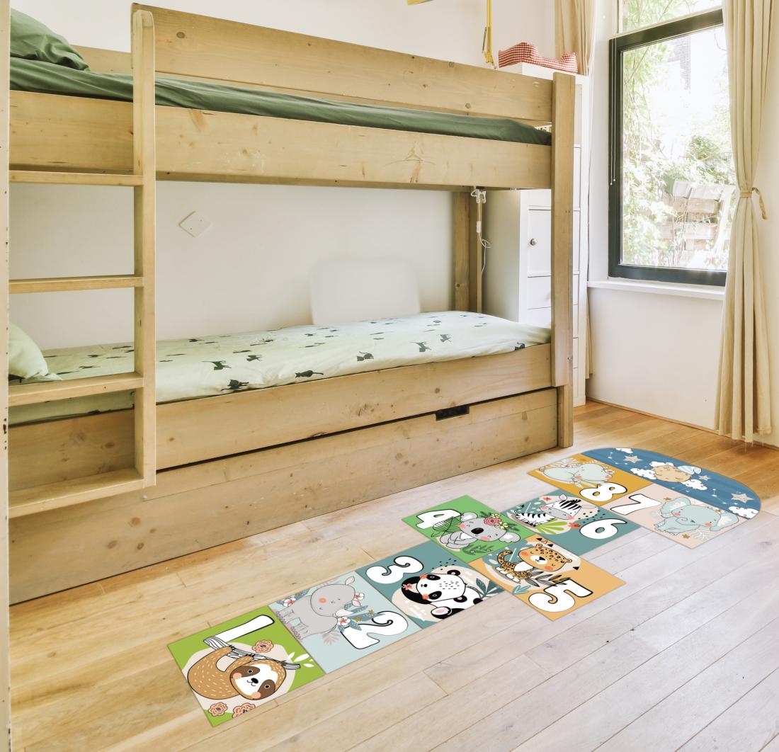 Marelle de sol GEANTE repositionnable souple. Format 99x134cm l'ensemble. Les cases font 40x33cm (environ 230cm de hauteur totale). Pour toutes surfaces lisse, mur, vitre, repositionnable. Visuel sur 1 seule face, souple et opaque. Application facile, retrait sans résidus de colle. Tarif non négociable.