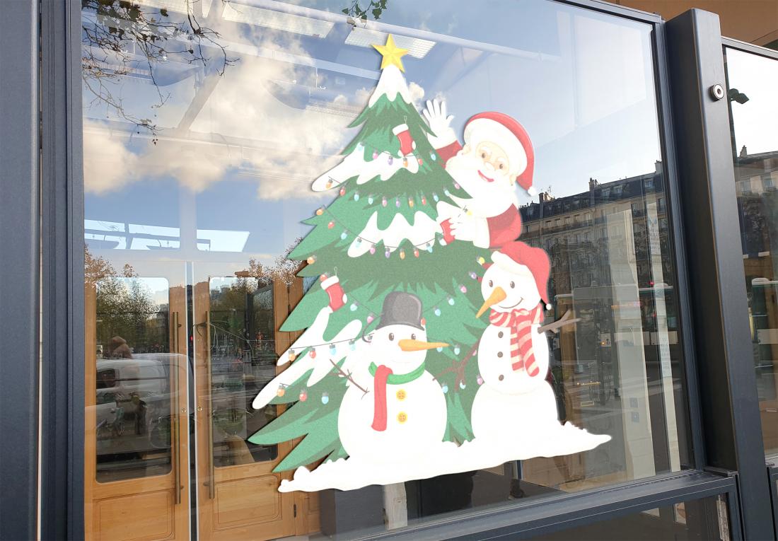 Décoration adhésive "SAPIN de NOEL". Format 100x105cm. Pour toutes surfaces lisse, mur, vitre, repositionnable. Visuel sur 1 seule face, souple et opaque. Application facile, retrait sans résidus de colle. Tarif non négociable.