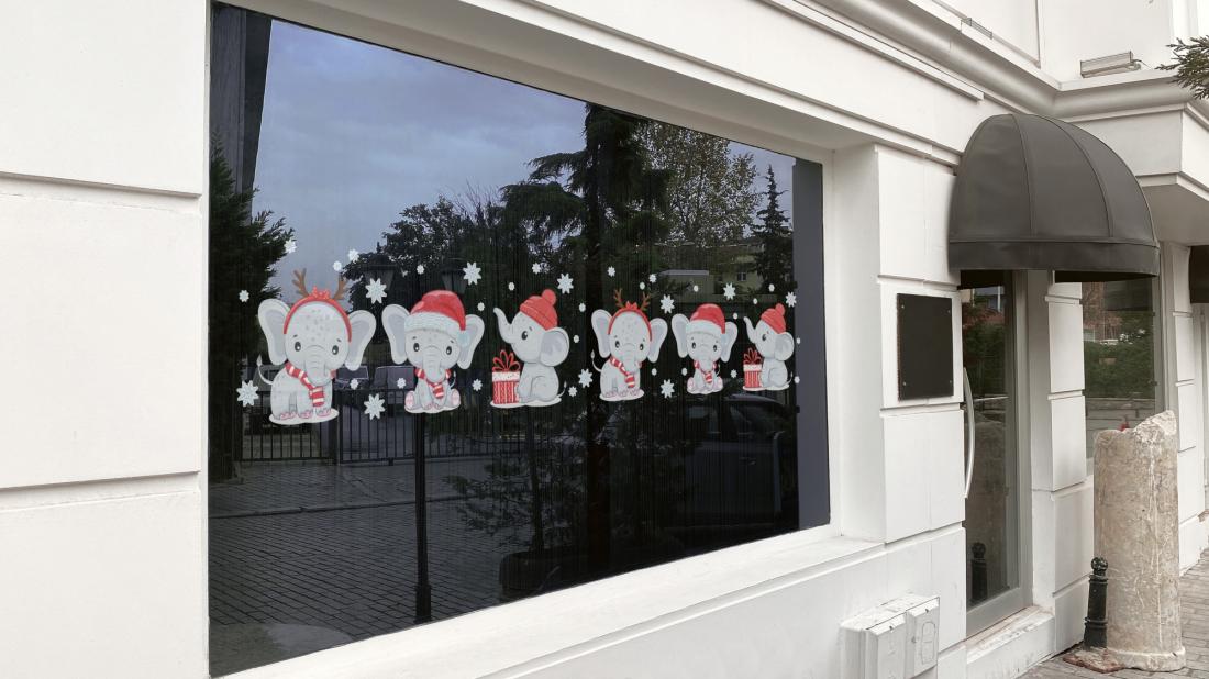 Décoration adhésive souple "Eléphants de Noel" Lot de 6 plus des étoiles. Format 100x19cm l'ensemble. Pour toutes surfaces lisse, mur, vitre, repositionnable. Visuel sur 1 seule face, souple et opaque. Application facile, retrait sans résidus de colle. Tarif non négociable.