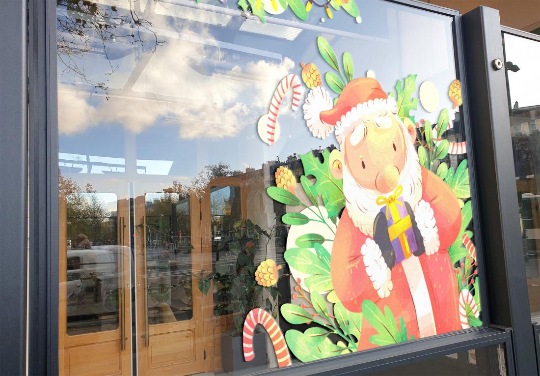 Décoration adhésive "Père Noel" Lot de 2. Format 100x39cm l'ensemble. Pour toutes surfaces lisse, mur, vitre, repositionnable. Visuel sur 1 seule face, souple et opaque. Application facile, retrait sans résidus de colle. Tarif non négociable.