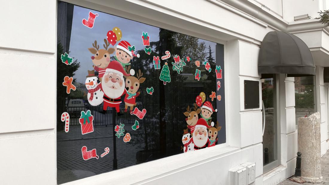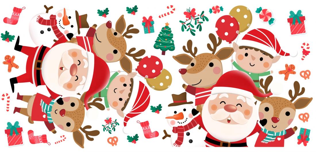 Décoration adhésive "Père Noel et décoration divers " . Format 100x48cm. Pour toutes surfaces lisse, mur, vitre, repositionnable. Visuel sur 1 seule face, souple et opaque. Application facile, retrait sans résidus de colle. Tarif non négociable.