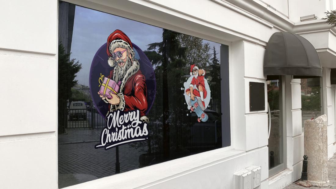 Décoration adhésive "Père Noel SKATEBOARD " . Format 100x48cm. Pour toutes surfaces lisse, mur, vitre, repositionnable. Visuel sur 1 seule face, souple et opaque. Application facile, retrait sans résidus de colle. Tarif non négociable.