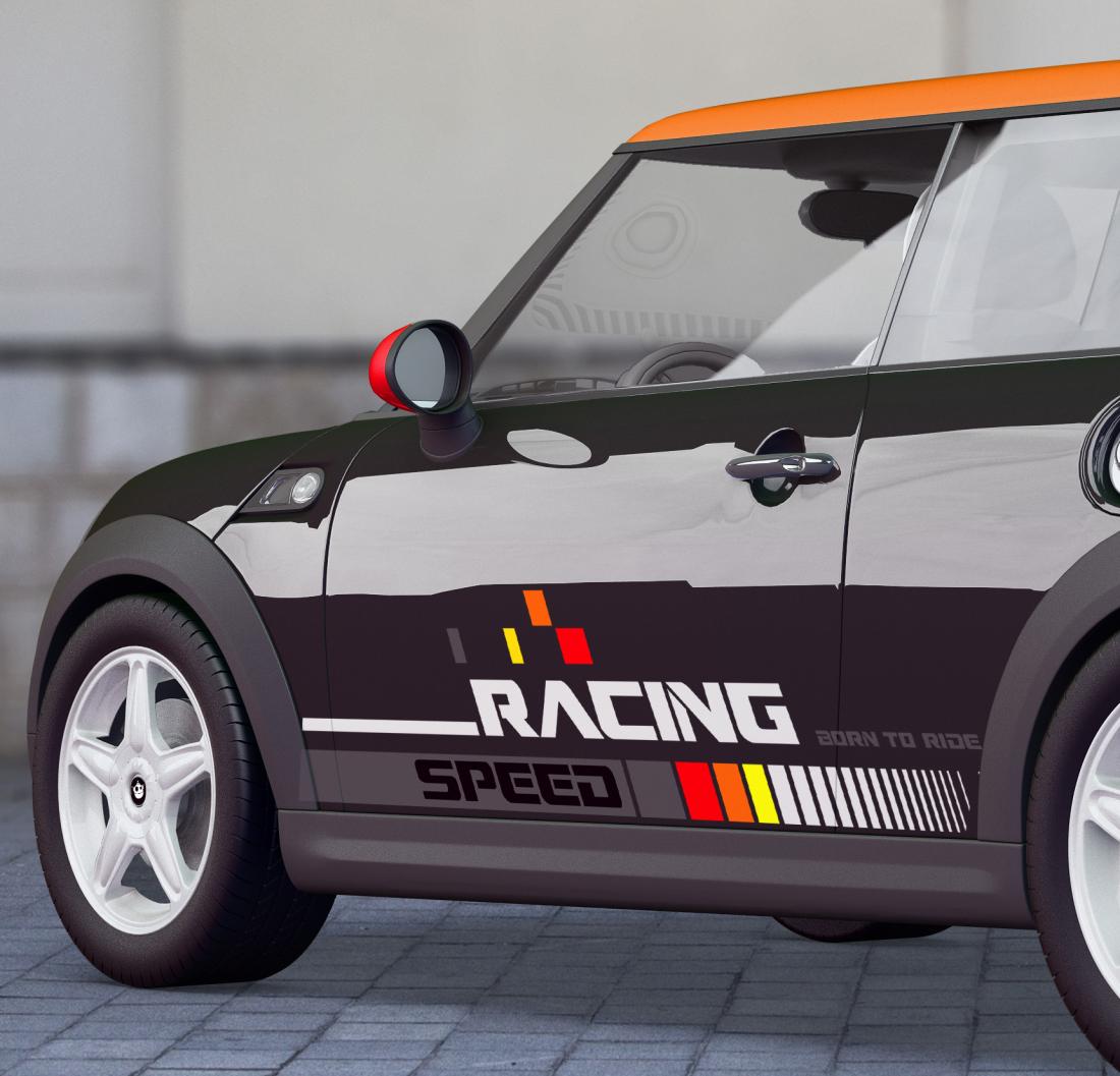 Adhésifs racing voiture 120x58cm, 2 motifs inversés. Pour toutes surfaces lisse, mur, vitre, voiture. Visuel sur 1 seule face, souple et opaque.