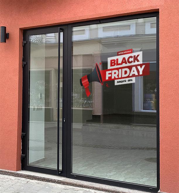 Stickers de vitre souple BLACK FRIDAY. Format 52x30cm de long l'un, lot de 2. Pour toutes surfaces lisse, mur, vitre, repositionnable. Visuel sur 1 seule face, souple et opaque. Application facile, retrait sans résidus de colle. Tarif non négociable.
