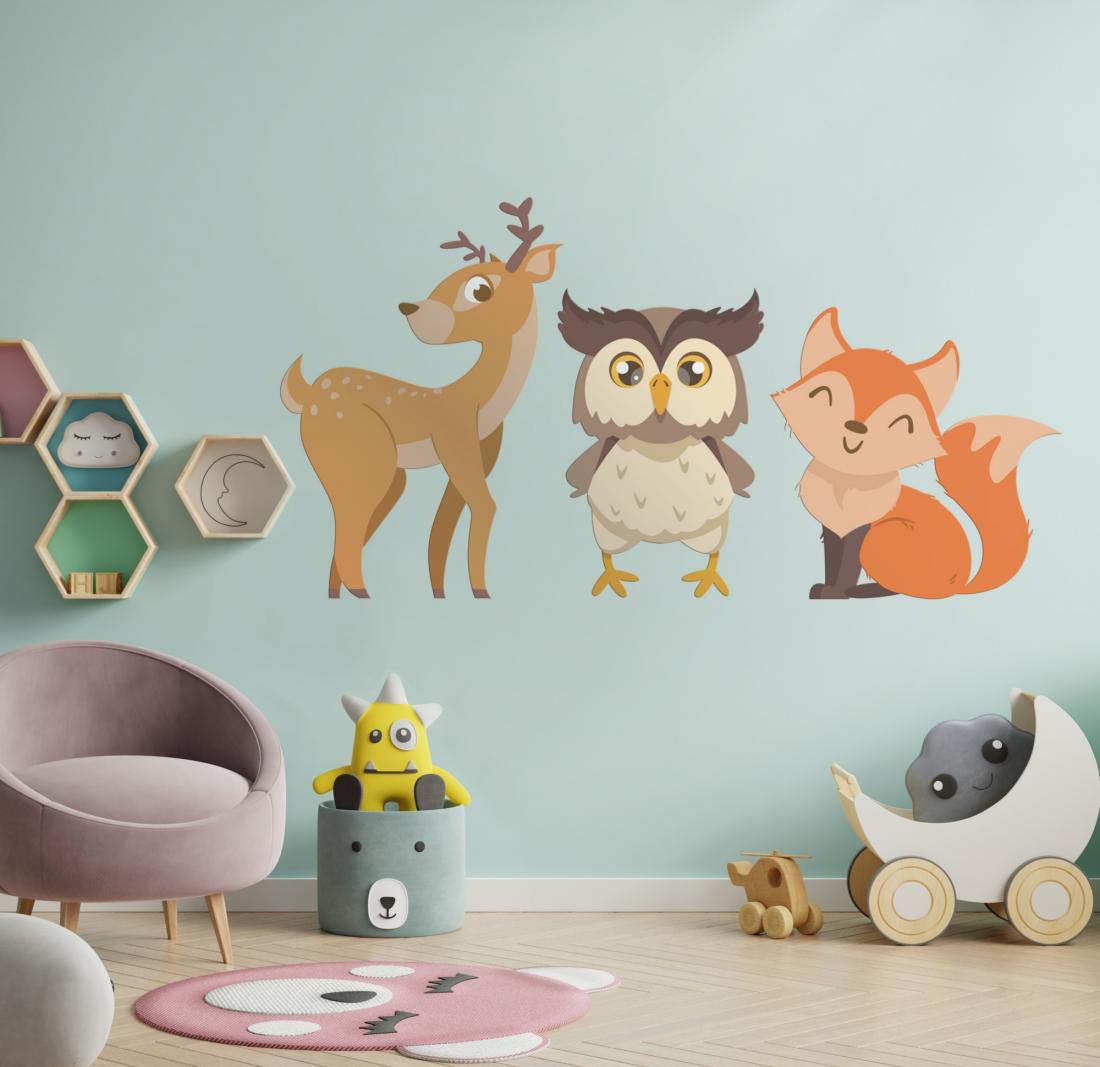 Stickers décoratif "Animaux de la forêt pour Enfant", lot complet (animaux + feuilles + arbres + ruches + abeilles). Format 100x45cm (l'ensemble). Pour toutes surfaces lisse, mur, vitre, repositionnable. Visuel sur 1 seule face, souple et opaque. Application facile, retrait sans résidus de colle. Tarif non négociable.