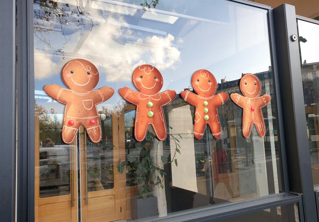 Décoration adhésive souple "Biscuits pain d'épice de Noël", lot de 4. Format 100x35cm (l'ensemble). Pour toutes surfaces lisse, mur, vitre, repositionnable. Visuel sur 1 seule face, souple et opaque. Application facile, retrait sans résidus de colle. Tarif non négociable.