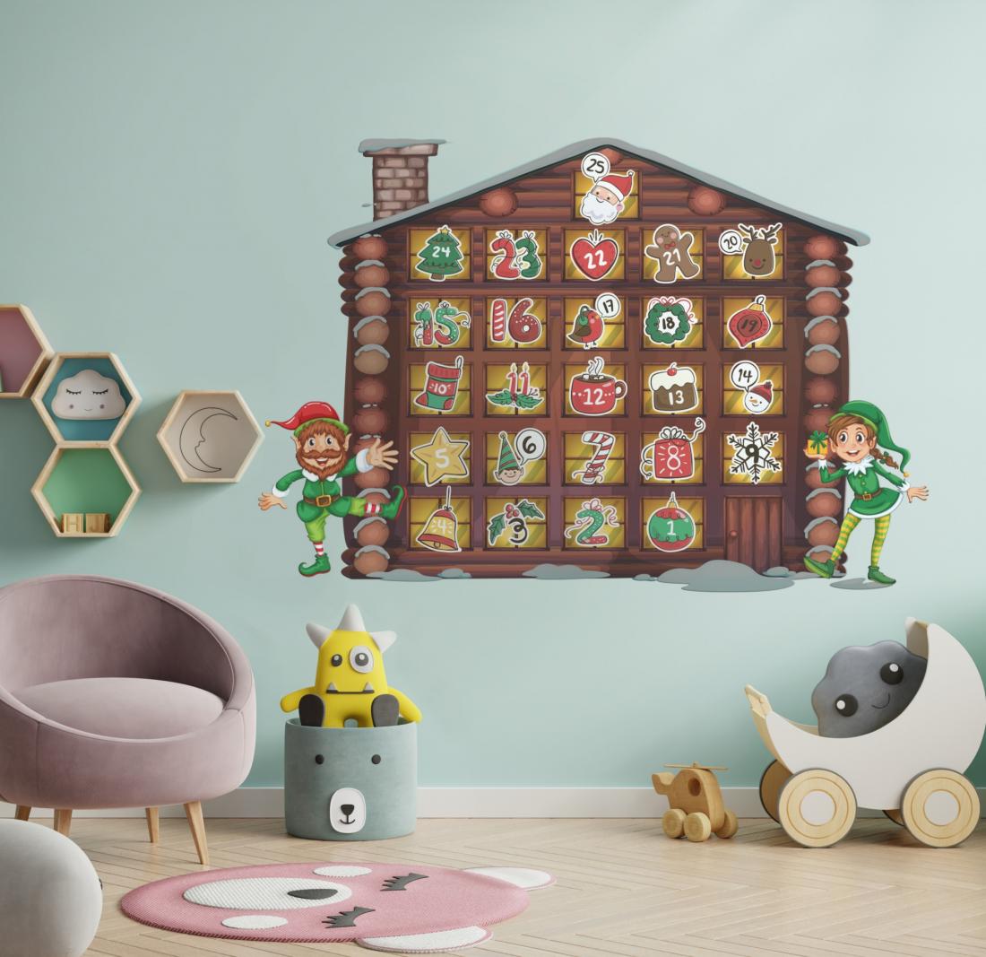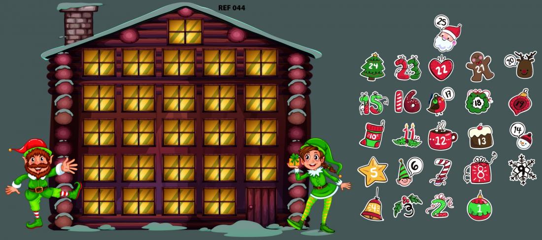 Décoration adhésive "calmendrier de l'avant" Lot maison + cases numéros à composer sois même. Format 100x44cm l'ensemble. Pour toutes surfaces lisse, mur, vitre, repositionnable. Visuel sur 1 seule face, souple et opaque. Application facile, retrait sans résidus de colle. Tarif non négociable.