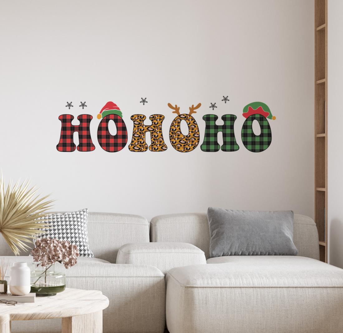 Décoration adhésive souple "Ho Ho Ho! de Noël". Format 100x30cm. Pour toutes surfaces lisse, mur, vitre, repositionnable. Visuel sur 1 seule face, souple et opaque. Application facile, retrait sans résidus de colle. Tarif non négociable.