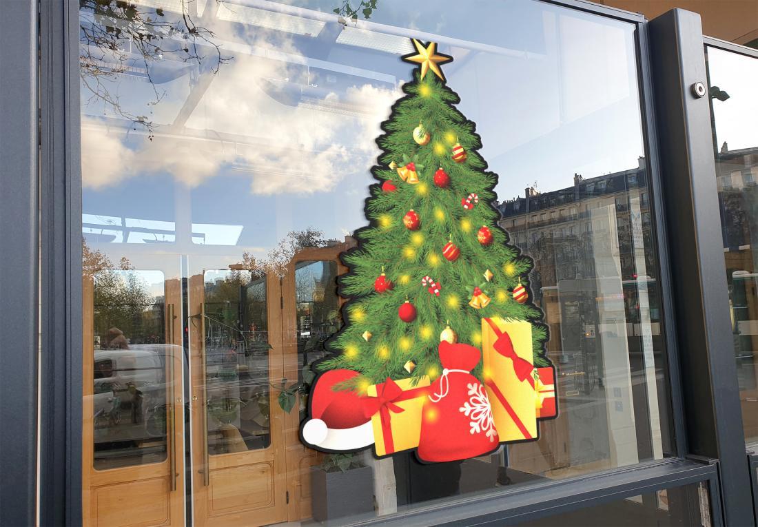 Décoration adhésive "Sapin de Noël". Format 100x75cm. Pour toutes surfaces lisse, mur, vitre, repositionnable. Visuel sur 1 seule face, souple et opaque. Application facile, retrait sans résidus de colle. Tarif non négociable.
