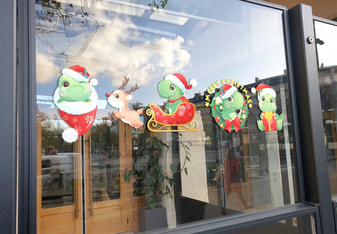 • Décoration adhésive "Dinosaures de Noël" Lot de 8. Format 100x61cm l'ensemble. Pour toutes surfaces lisse, mur, vitre, repositionnable. Visuel sur 1 seule face, souple et opaque. Application facile, retrait sans résidus de colle. Tarif non négociable.