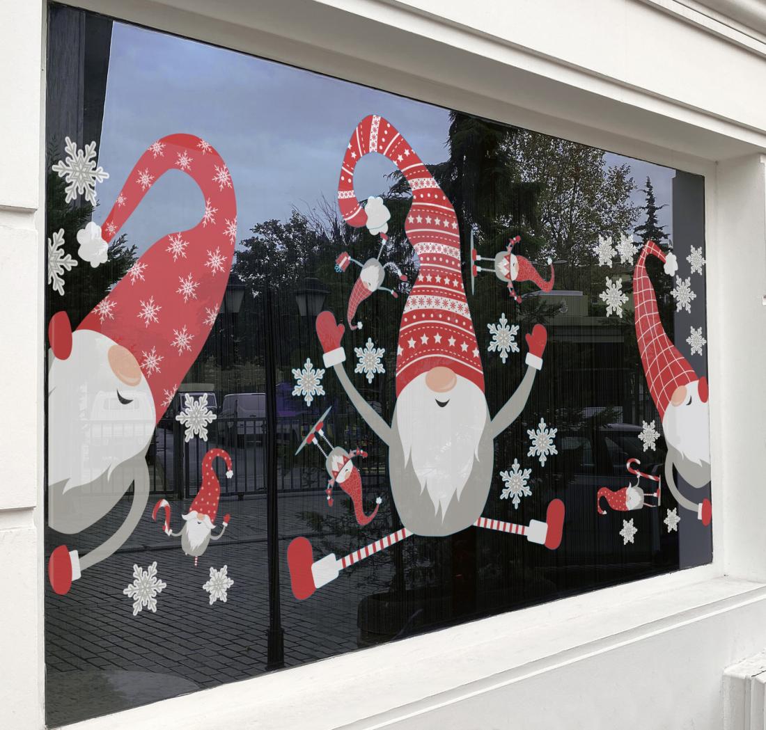 Décoration adhésive "Lutins de noel" . Format 100x46cm. Pour toutes surfaces lisse, mur, vitre, repositionnable. Visuel sur 1 seule face, souple et opaque. Application facile, retrait sans résidus de colle. Tarif non négociable.