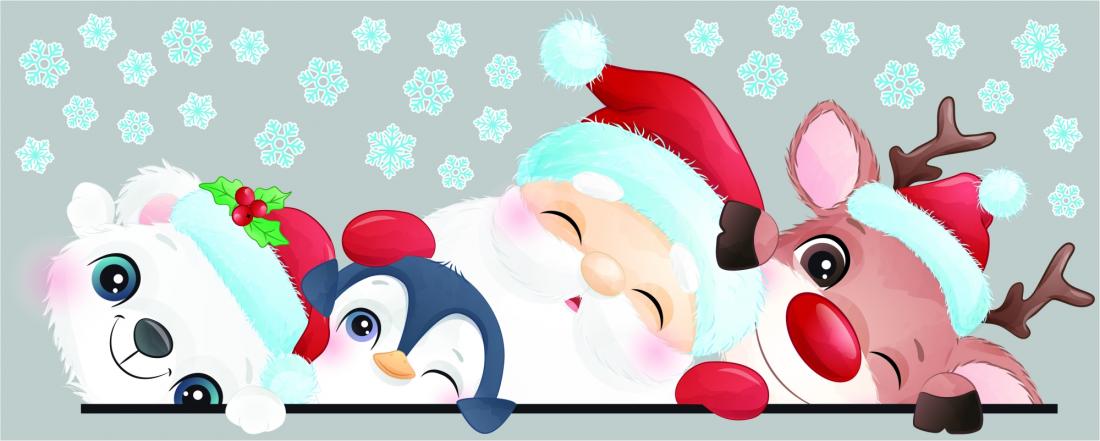 Décoration adhésive "personnages de Noel" . Format 100x40cm. Pour toutes surfaces lisse, mur, vitre, repositionnable. Visuel sur 1 seule face, souple et opaque. Application facile, retrait sans résidus de colle.