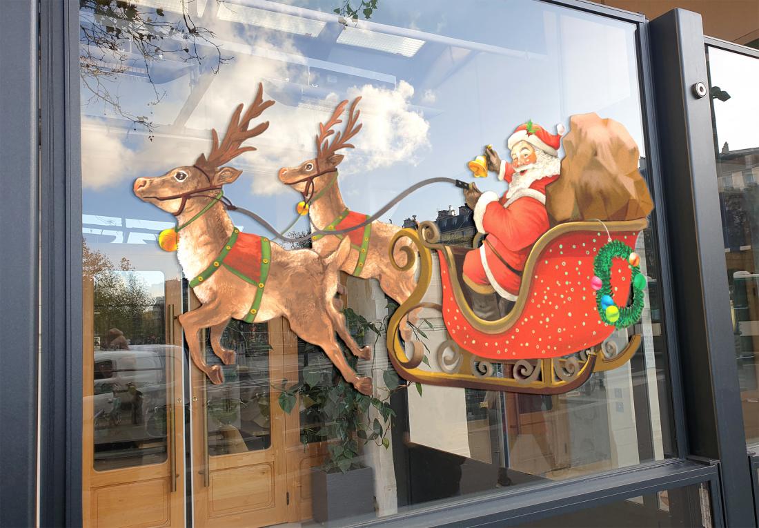 Décoration adhésive souple "Traineau du Père Noël". Format 100x66cm. Pour toutes surfaces lisse, mur, vitre, repositionnable. Visuel sur 1 seule face, souple et opaque. Application facile, retrait sans résidus de colle. Tarif non négociable.